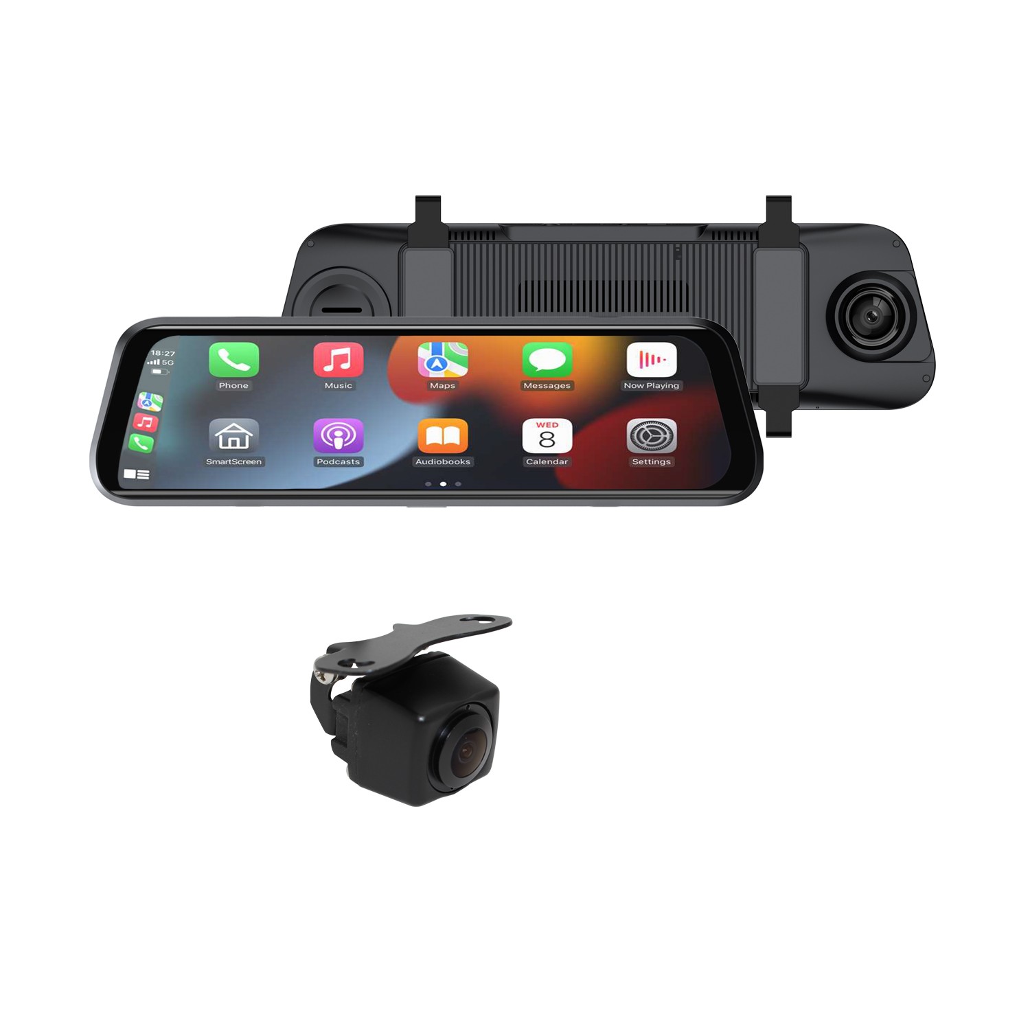 | – Aspect Ratio: – Screen Size: – Resolution: – Video Input: – Voltage: – Touch Screen: – Android Auto/Apple CarPlay: – Bluetooth: – Speaker: – Recording: – Camera: | 16:9 9.6″ Full HD x1 jac plug 12V–24V (will require dropper) Yes Yes, wireless connection Yes (for phone call connection) No (connects via FM to vehicle radio) Yes, SD card Max 128G Built-in forward camera 1080HD |